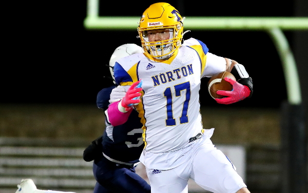 Norton improved to 7-0 after a 28-6 road win against Thomas More Prep-Marian at Lewis Field Stadium. The game was played in high winds and blustery conditions. Norton scored one touchdown in each quarter and often had drives of 10-plus plays with multiple third and fourth down conversions. Norton ran 68 plays, while TMP had 30. Junior Eli Jones finished 14 of 21 passing for 179 yards with two scores against one interception. Tyce Melvin picked off a pass.